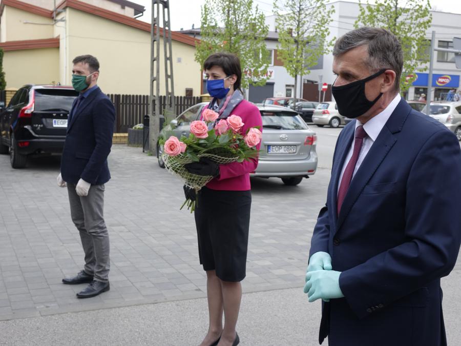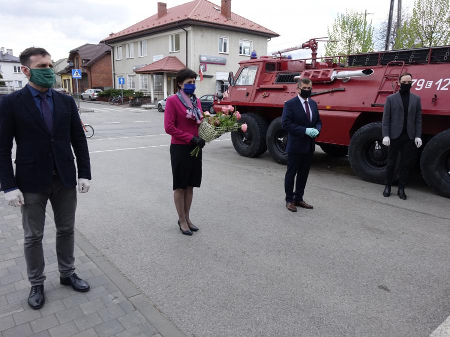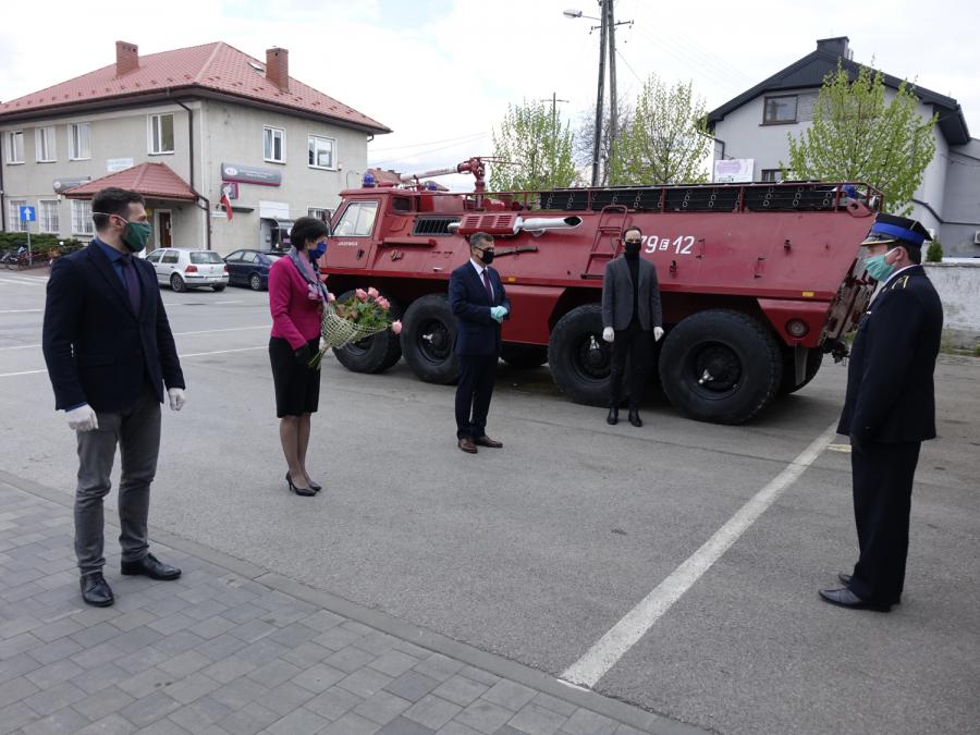 Spotkanie zorganizowane przed strażnicą Ochotniczej Straży Pożarnej w Drzewicy przebiegało z zachowaniem niezbędnych zasad bezpieczeństwa sanitarnego. Zgromadziło przedstawicieli władz samorządowych Gminy Drzewica: Burmistrza Janusza Reszelewskiego, Zastępcę Burmistrza Dominika Niemirskiego, Przewodniczącą Rady Miejskiej w Drzewicy Dorotę Wiktorowicz i Sekretarza Miasta Andrzeja Krzyżanowskiego, a także strażaków, w tym Gminnego Komendanta OSP Mariana Kalużnego oraz Wiceprezesa - Naczelnika OSP w Drzewicy druha Ryszarda Sobkiewicza.