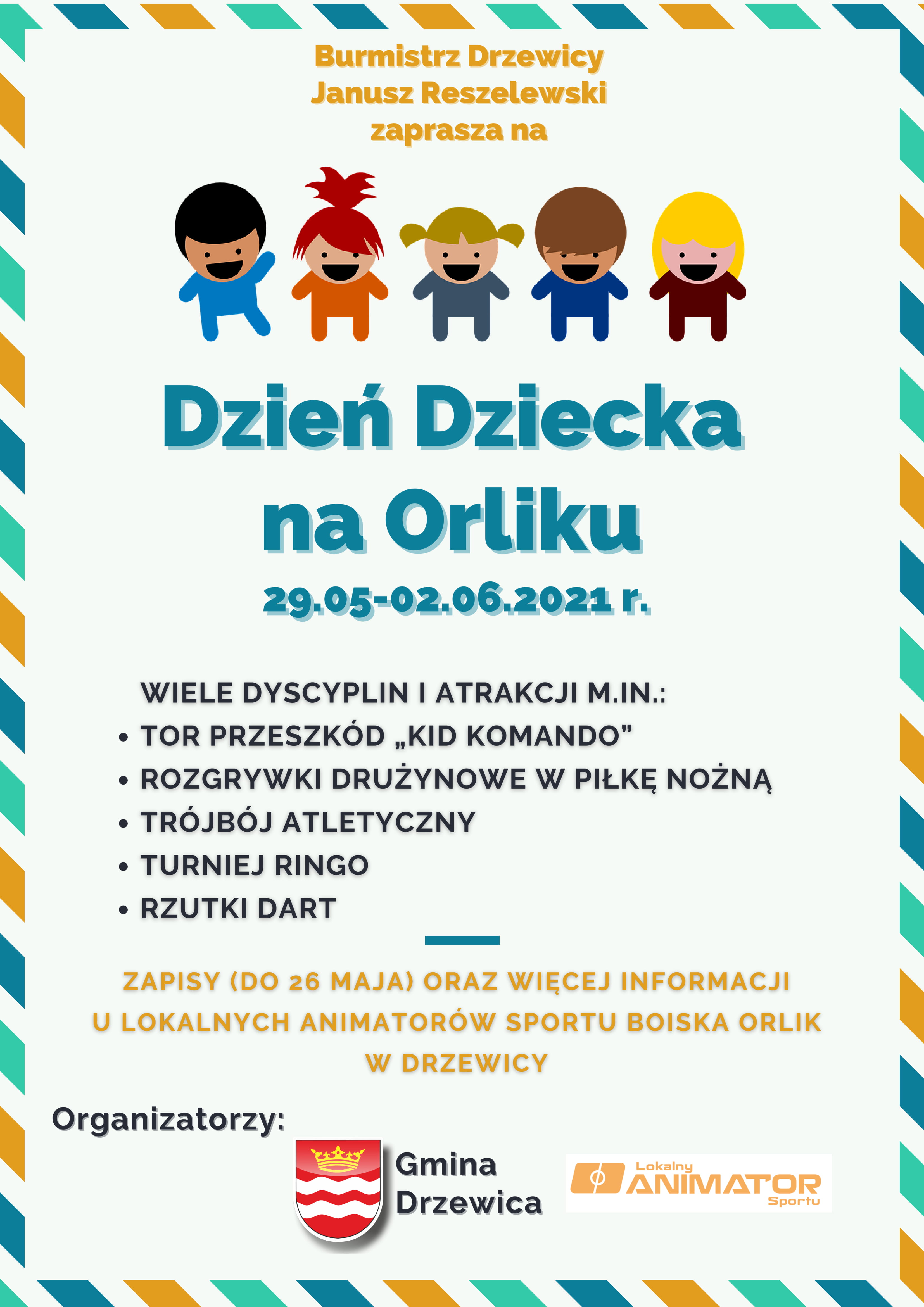 Urząd Miejski w Drzewicy oraz animatorzy sportu na Orliku w Drzewicy zapraszają do udziału w sportowych obchodach Dnia Dziecka. Konkurencje indywidualne i drużynowe zostaną rozegrane 29 maja oraz 1 i 2 czerwca 2021 roku.