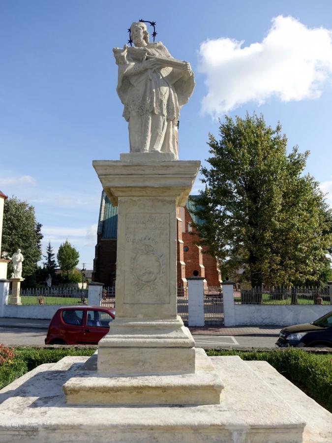 Figura św. Jana Nepomucena w Drzewicy została wykonana w stylu rokoko w 1788 r., prawdopodobnie przez mało znanego rzeźbiarza Martinusa Meira. Wznosi się na wysokim cokole (185 cm) o przekroju kwadratu z profilowanym zwieńczeniem i podstawą (bazą). Cokół ustawiono na podwyższeniu zbudowanym z trzech schodów o długości boku 85 cm, 100 cm i 300 cm oraz łącznej wysokości 60 cm. Na frontalnej ścianie cokołu widnieje tablica z herbem Junosza rodziny Szaniawskich oraz inskrypcja. Postać świętego o wysokości ok. 150 cm w swoich proporcjach i układzie kompozycyjnym zwraca uwagę elegancją, umiarem i delikatnością. Głowa zwrócona jest ku prawemu ramieniu. Podniesione do wysokości piersi ręce podtrzymują krzyż z Chrystusem wspartym o prawe ramię świętego. Postać odziana jest w szaty liturgiczne: sutannę, komżę dołem obrzeżoną szeroką koronką, krótką pelerynkę okrywającą ramiona oraz biret. Wokół głowy znajduje się metalowa aureola z gwiazdami. Wyryta na tablicy inskrypcja głosi: TA STATUA KOSZTEM / LUDWIKI Z ZAŁUSKICH / SZANIAWSKIEY STAROŚCINY BOLESŁAWSKIEJ JEST / WYSTAWIONA oraz poniżej kartusz z herbem: ANNO DNI 1788 / DIE 11 JUNY