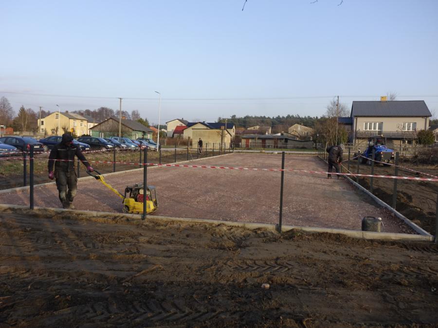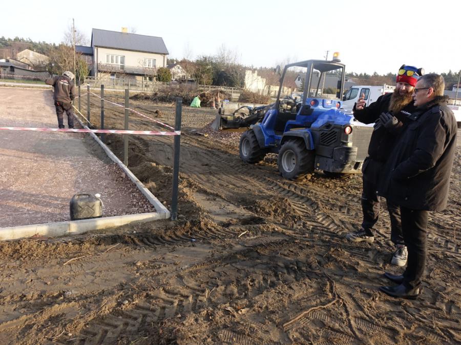 Po przygotowaniu i zabezpieczeniu miejsca robót wykonawca rozpoczął prace ziemne, wykonywanie podbudowy oraz montaż ogrodzenia. Niebawem przystąpi do układania nawierzchni z poliuretanu i kostki brukowej oraz do przygotowania fundamentów pod zamontowanie urządzeń do zabawy.