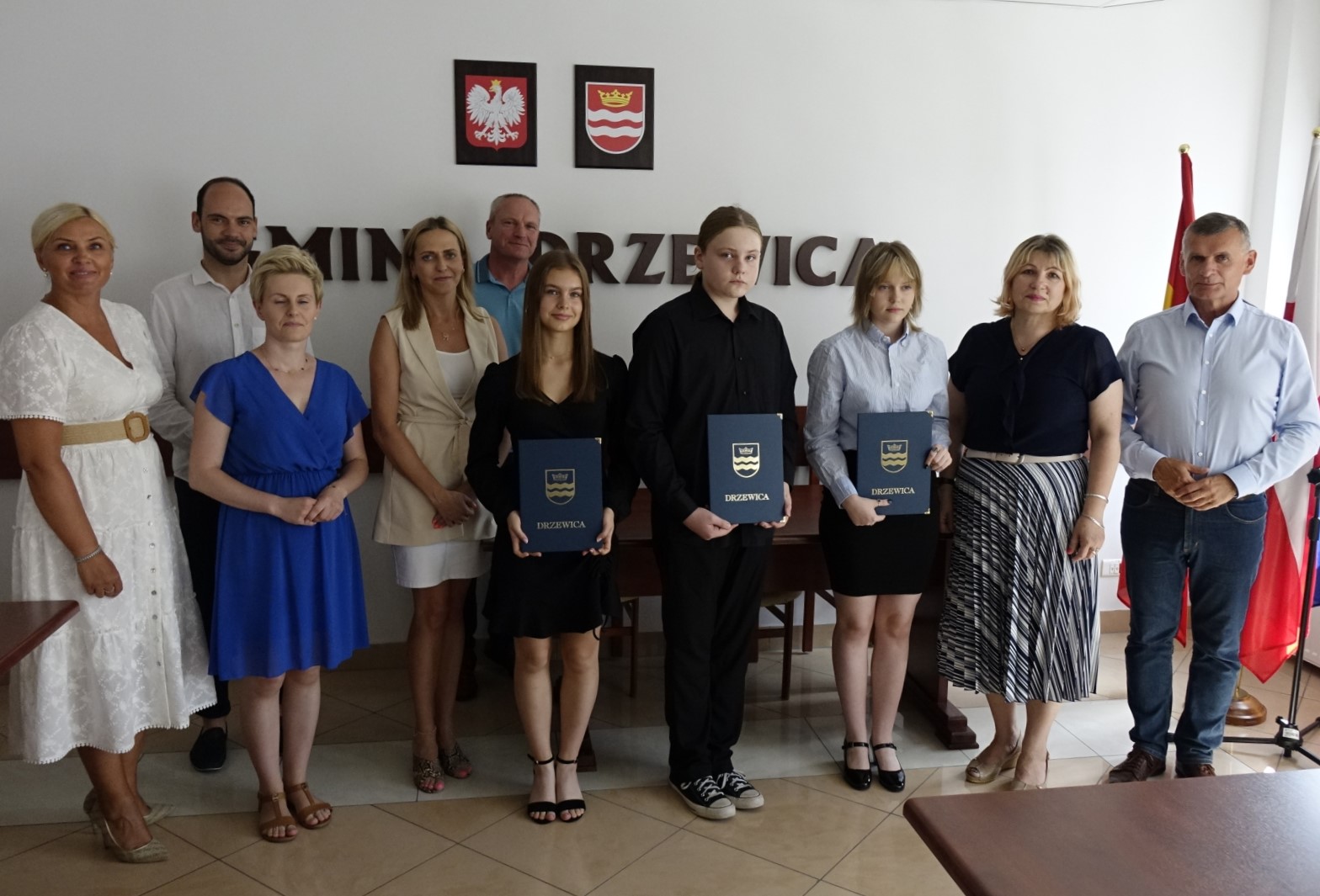 Uroczyste spotkanie ze stypendystami, ich rodzinami i dyrektorką SP w Drzewicy Małgorzatą Kuchenbecker miało miejsce w sali konferencyjnej Urzędu Miejskiego w Drzewicy. Stypendia oraz listy gratulacyjne wręczył uczniom Burmistrz Drzewicy Janusz Reszelewski w obecności Zastępcy Burmistrza Dominika Niemirskiego oraz Dyrektor Zespołu Ekonomiczno-Administracyjnego Szkół Agnieszki Kopytowskiej.