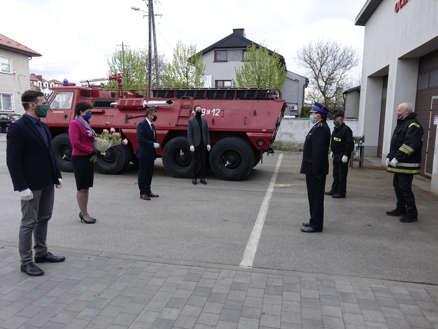 Spotkanie zorganizowane przed strażnicą Ochotniczej Straży Pożarnej w Drzewicy przebiegało z zachowaniem niezbędnych zasad bezpieczeństwa sanitarnego. Zgromadziło przedstawicieli władz samorządowych Gminy Drzewica: Burmistrza Janusza Reszelewskiego, Zastępcę Burmistrza Dominika Niemirskiego, Przewodniczącą Rady Miejskiej w Drzewicy Dorotę Wiktorowicz i Sekretarza Miasta Andrzeja Krzyżanowskiego, a także strażaków, w tym Gminnego Komendanta OSP Mariana Kalużnego oraz Wiceprezesa - Naczelnika OSP w Drzewicy druha Ryszarda Sobkiewicza.
