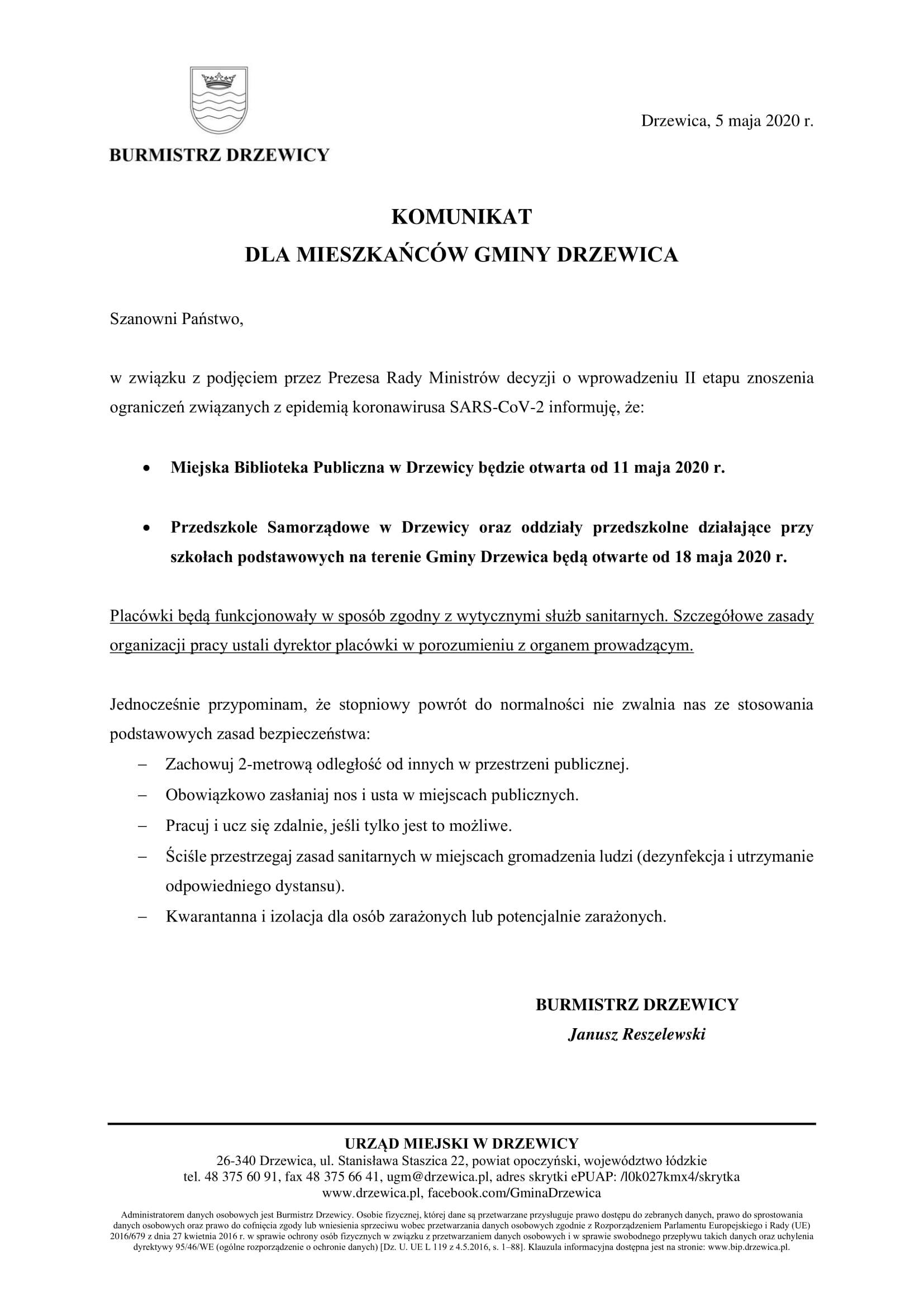 Strona główna » Urząd » Komunikat w sprawie otwarcia Miejskiej Biblioteki Publicznej, Przedszkola Samorządowego i oddziałów przedszkolnych w Gminie Drzewica