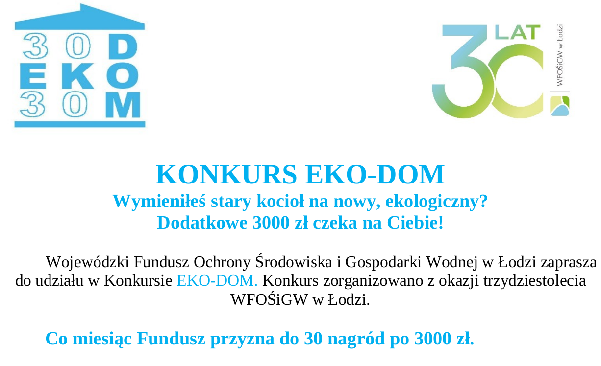 Wojewódzki Fundusz Ochrony Środowiska i Gospodarki Wodnej w Łodzi zaprasza do udziału w Konkursie EKO-DOM. Konkurs zorganizowano z okazji trzydziestolecia WFOŚiGW w Łodzi. Co miesiąc Fundusz przyzna do 30 nagród po 3000 zł.