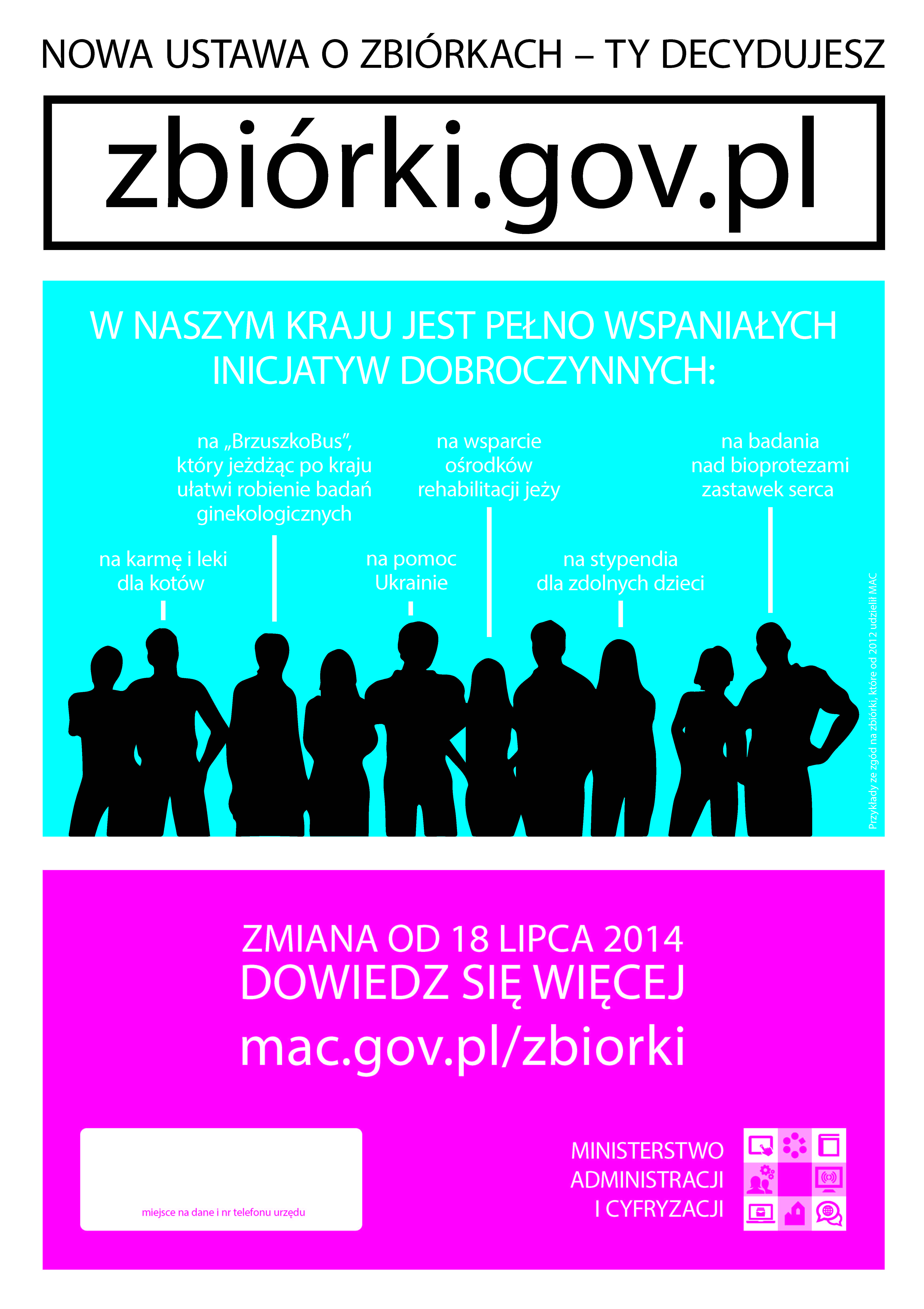 18 lipca weszła w życie nowa ustawa o zbiórkach publicznych. Nowa ustawa została opracowana przez Ministerstwo Administracji i Cyfryzacji wspólnie z organizacjami pozarządowymi. Zwiększa dostępność informacji o zbiórkach dla wszystkich obywateli, o tym, kto i na jakie cele zbiera środki. Wprowadza też elektroniczną, sprawną formę zgłaszania zbiórek.
