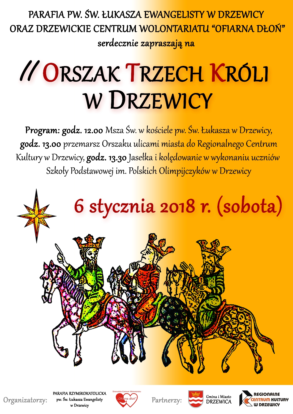 Zapraszamy na orszak Trzech Króli w Drzewicy. Poniżej plakat i program obchodów święta.