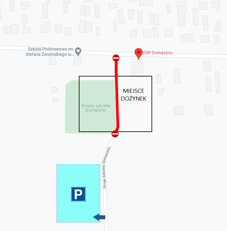 W niedzielę, 28 sierpnia 2022 roku parking będzie zlokalizowany po lewej stronie drogi gminnej tzw. drogi szkolnej prowadzącej od drogi wojewódzkiej nr 728 w kierunku Szkoły Podstawowej im. Stefana Żeromskiego oraz Świetlicy Wiejskiej w Domasznie.
