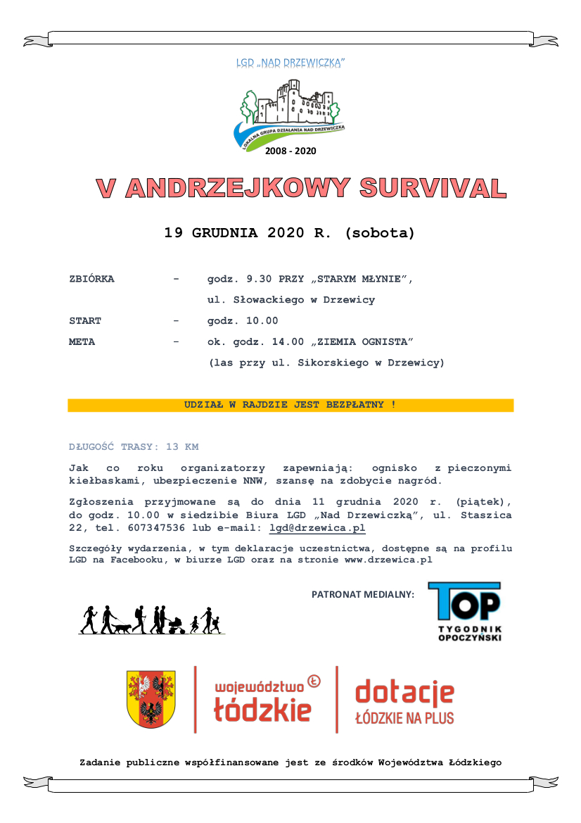 Jeśli sytuacja epidemiczna na to pozwoli, to w dniu 19 grudnia 2020 r. odbędzie się piąta edycja rajdu pieszego organizowanego przez LGD „Nad Drzewiczką” pn. „Andrzejkowy survival”.