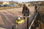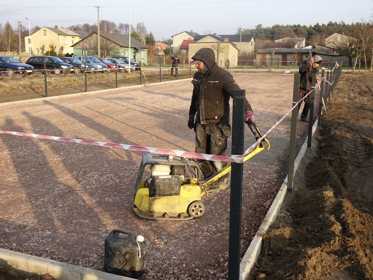 Po przygotowaniu i zabezpieczeniu miejsca robót wykonawca rozpoczął prace ziemne, wykonywanie podbudowy oraz montaż ogrodzenia. Niebawem przystąpi do układania nawierzchni z poliuretanu i kostki brukowej oraz do przygotowania fundamentów pod zamontowanie urządzeń do zabawy.