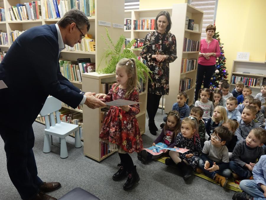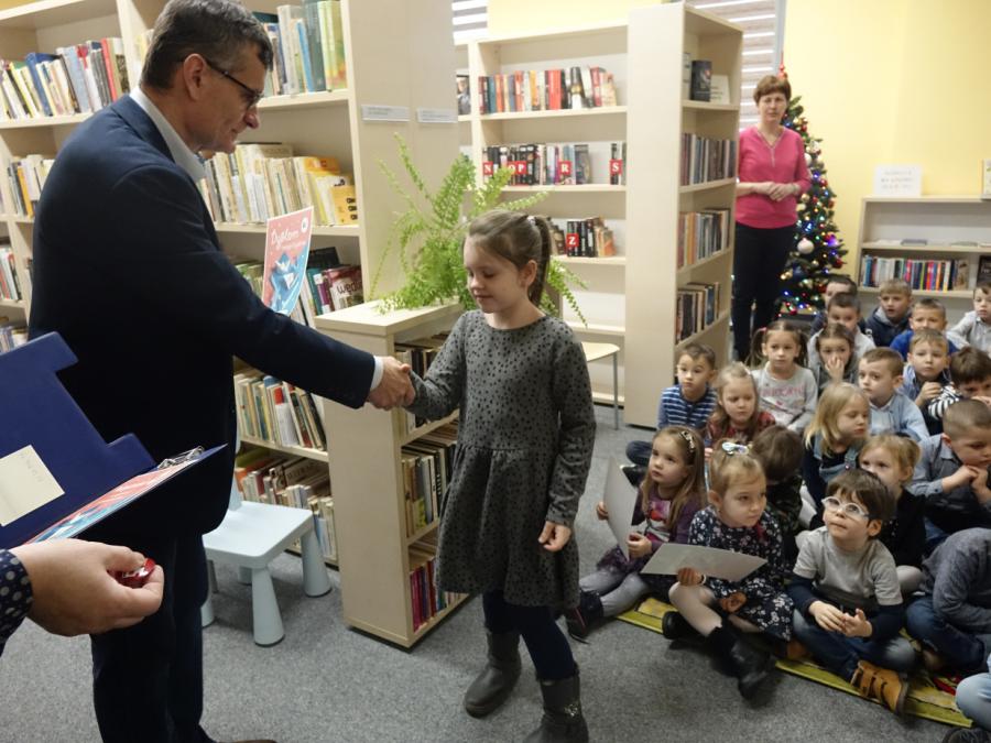 Za każdą wizytę w bibliotece dzieci dostawały naklejkę. Te, które zebrały dziesięć punktów, odebrały z rąk Burmistrza Janusza Reszelewskiego imienny dyplom, potwierdzający czytelnicze zainteresowania. Gospodarz Gminy przeczytał ponadto dzieciom książkę Davida Litchfielda Niedźwiedź i pianino. Lektura była pretekstem do rozmowy z dziećmi o przyjaźni.