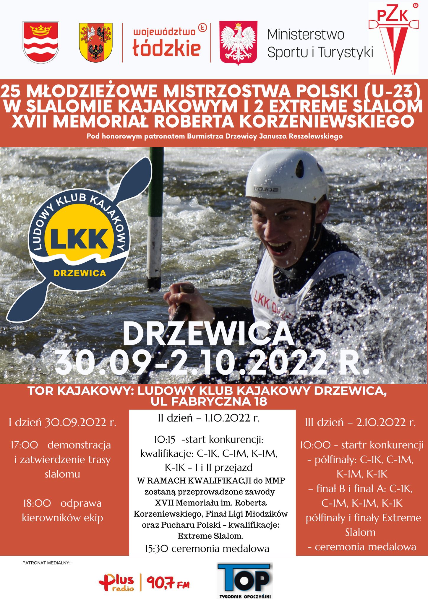 W najbliższy weekend, 1-2 października 2022 roku na torze w Drzewicy zostaną rozegrane XXV Młodzieżowe Mistrzostwa Polski w slalomie kajakowym, II Młodzieżowe Mistrzostwa Polski w slalomie ekstremalnym oraz XVII Memoriał Roberta Korzeniewskiego połączony z Finałem Ligi Młodzików i Pucharu Polski 2022 w slalomie kajakowym. Honorowym patronem zawodów jest Burmistrz Drzewicy Janusz Reszelewski.