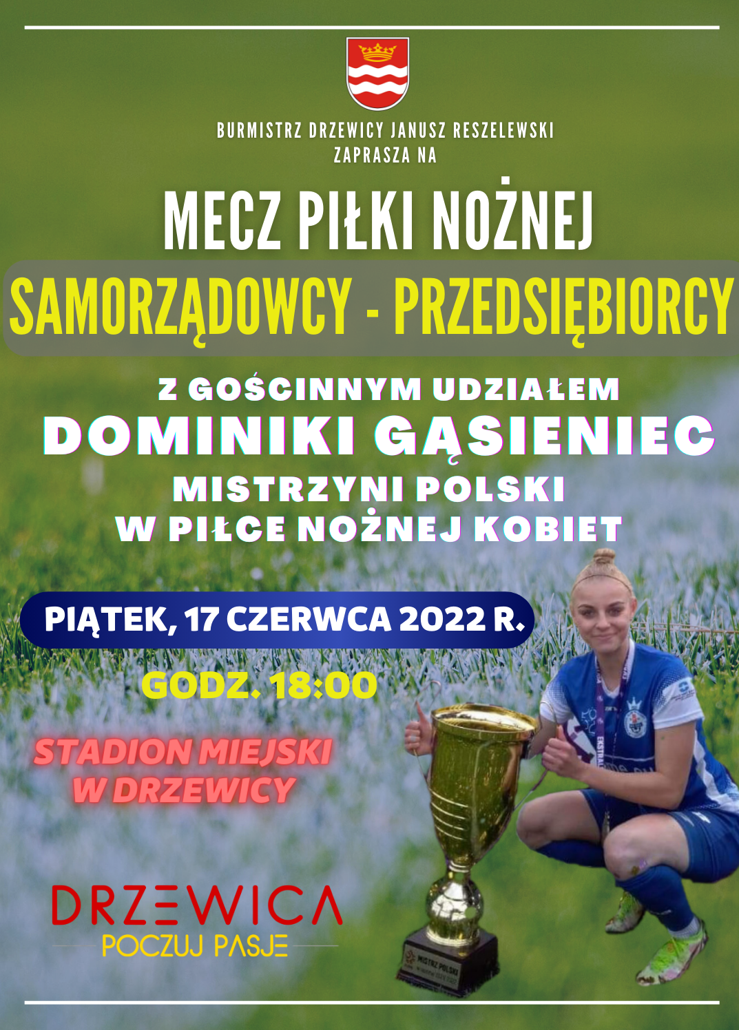 Miło nam poinformować, że w drużynie Samorządowców wystąpi Mistrzyni Polski w piłce nożnej kobiet, drzewiczanka Dominika Gąsieniec. Zapowiadają się wielkie emocje.