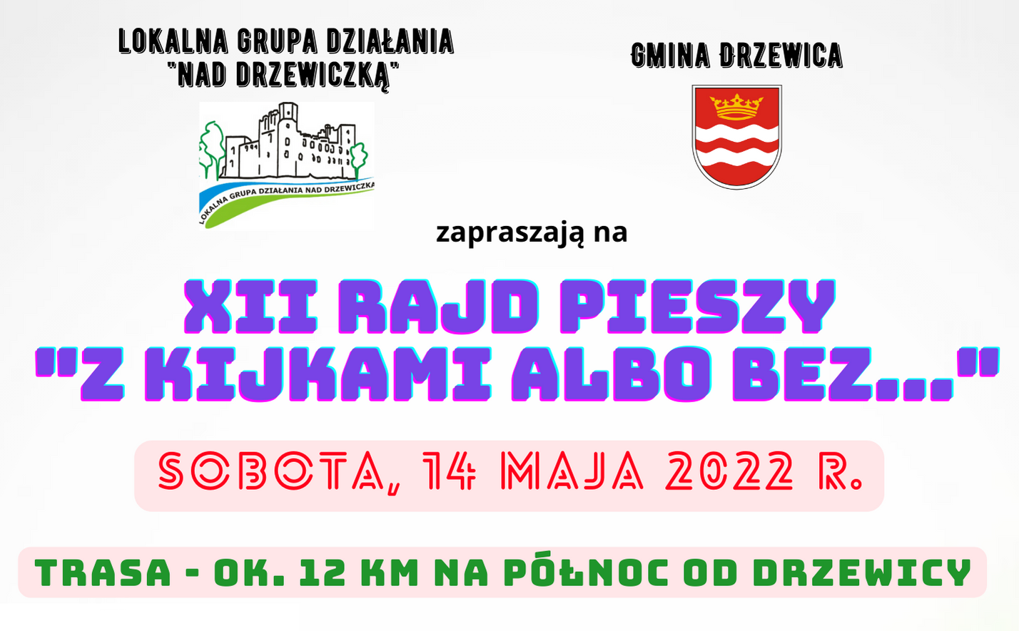 Burmistrz Drzewicy Janusz Reszelewski, Przewodnicząca Gminnej Komisji Rozwiązywania Problemów Alkoholowych Irena Kwiecień oraz Zarząd Lokalnej Grupy Działania „Nad Drzewiczką” zapraszają miłośników pieszych wędrówek na dwunastą edycję Rajdu Pieszego "Z kijkami albo bez…". Rajd odbędzie się w sobotę, 14 maja 2022 roku.